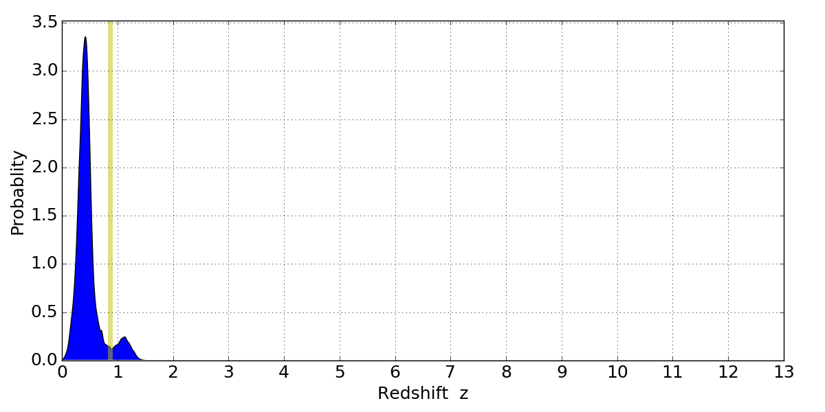 In P(z) plots: Yellow lines mark the cluster redshift z = 0.870,