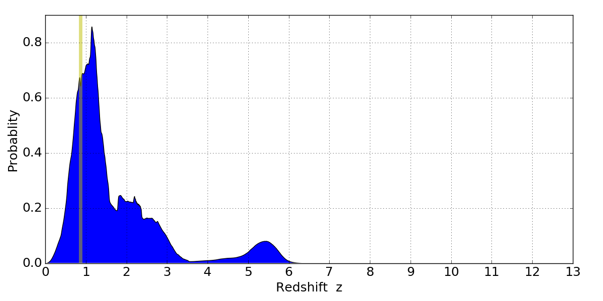 In P(z) plots: Yellow lines mark the cluster redshift z = 0.870,