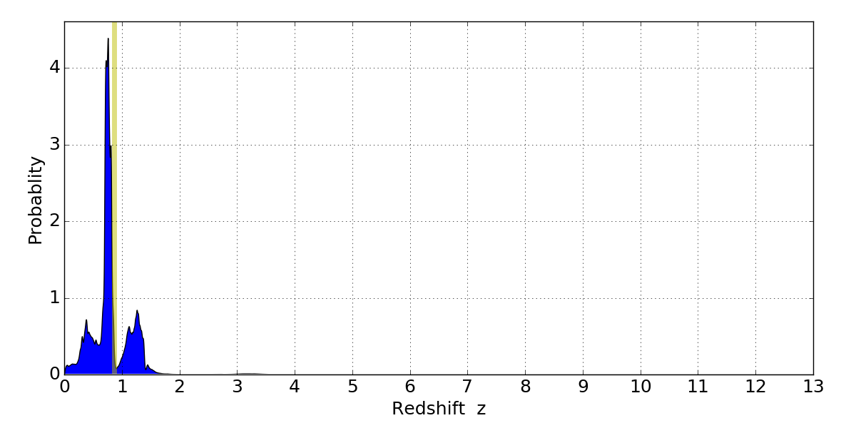 In P(z) plots: Yellow lines mark the cluster redshift z = 0.870,