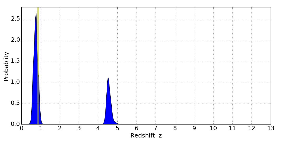 In P(z) plots: Yellow lines mark the cluster redshift z = 0.870,