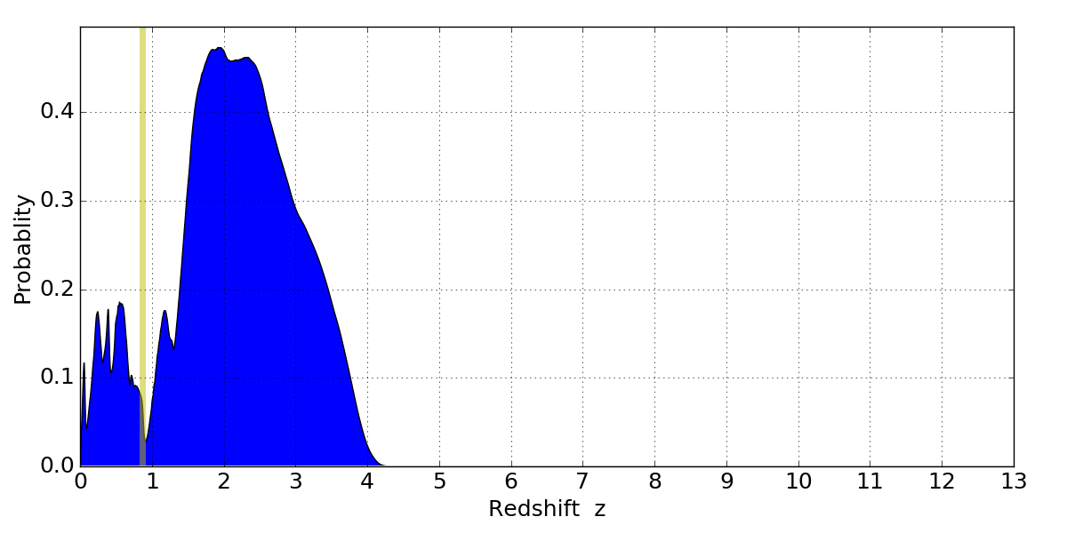In P(z) plots: Yellow lines mark the cluster redshift z = 0.870,