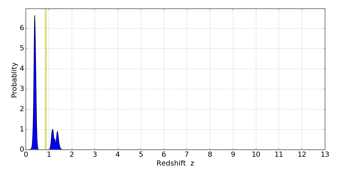 In P(z) plots: Yellow lines mark the cluster redshift z = 0.870,