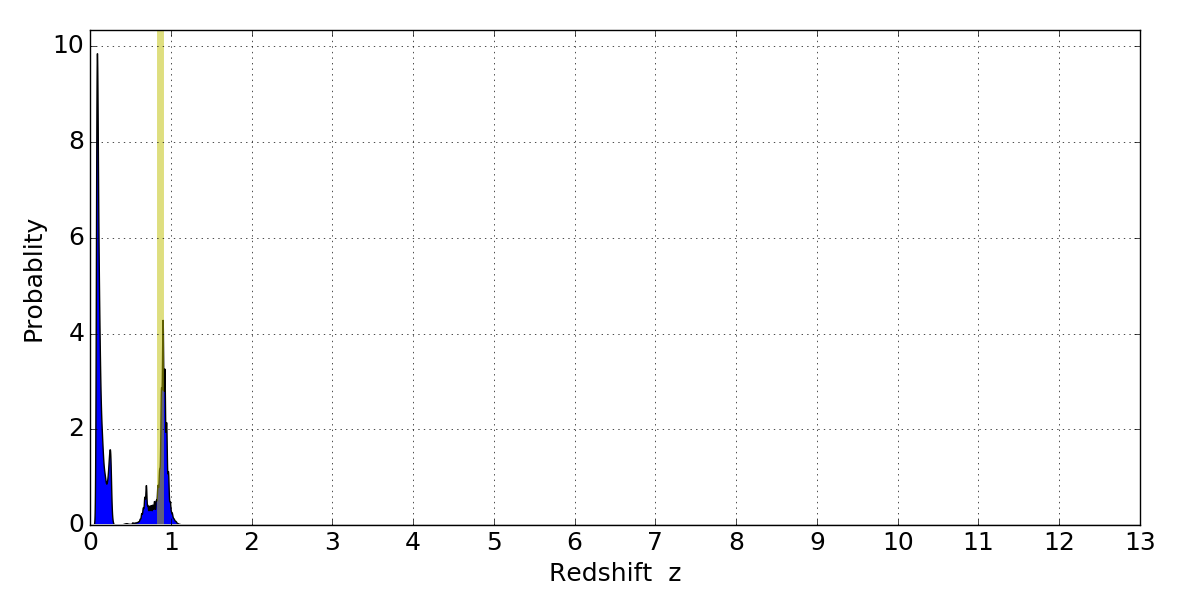 In P(z) plots: Yellow lines mark the cluster redshift z = 0.870,