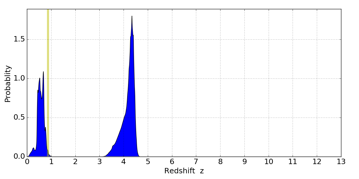 In P(z) plots: Yellow lines mark the cluster redshift z = 0.870,