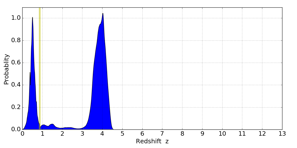 In P(z) plots: Yellow lines mark the cluster redshift z = 0.870,