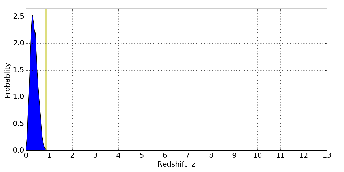In P(z) plots: Yellow lines mark the cluster redshift z = 0.870,