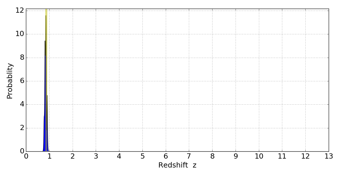 In P(z) plots: Yellow lines mark the cluster redshift z = 0.870,