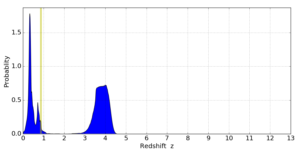 In P(z) plots: Yellow lines mark the cluster redshift z = 0.870,