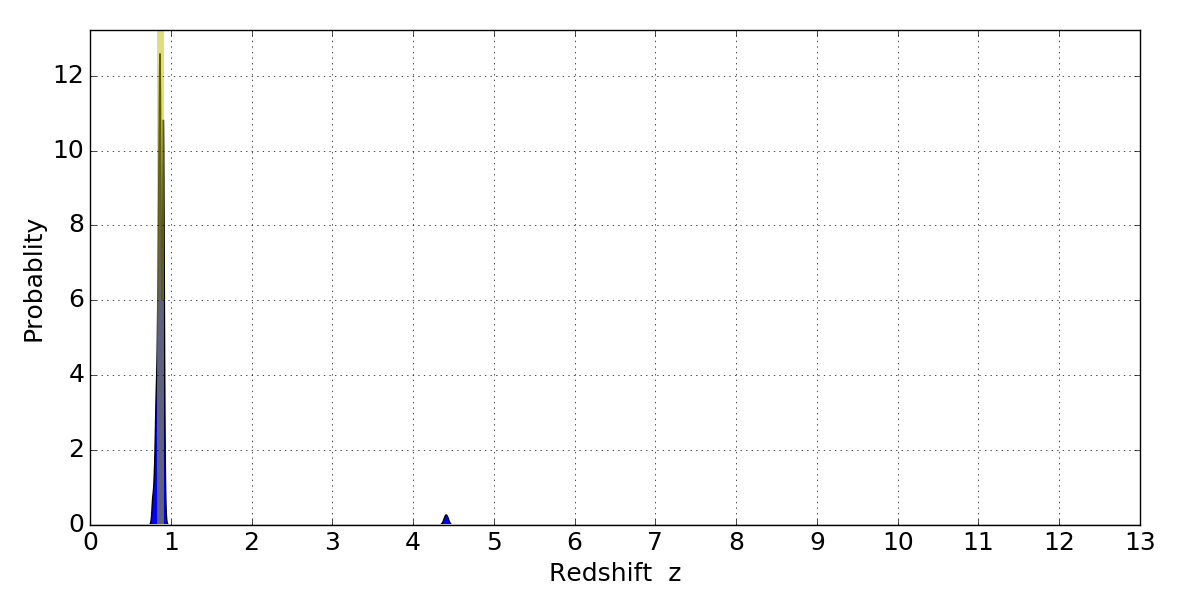 In P(z) plots: Yellow lines mark the cluster redshift z = 0.870,