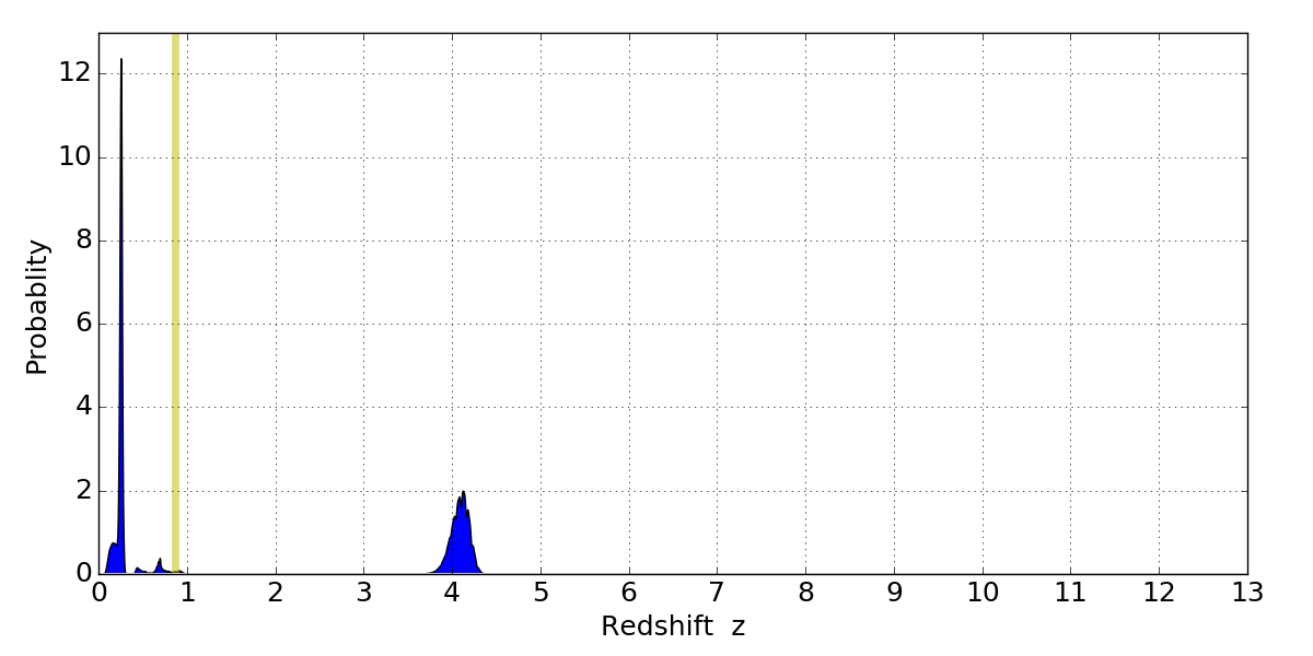 In P(z) plots: Yellow lines mark the cluster redshift z = 0.870,