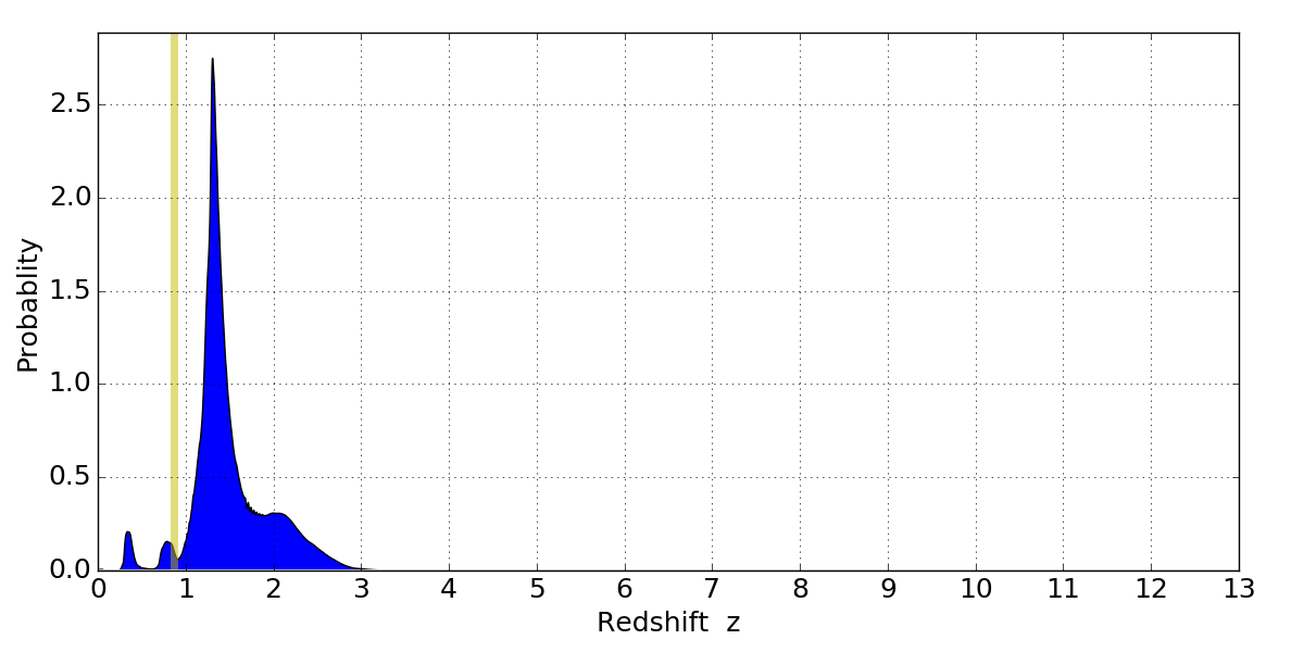 In P(z) plots: Yellow lines mark the cluster redshift z = 0.870,