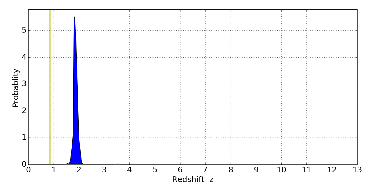 Object #6456   x,y = (1830, 2805)   RA, Dec = (01:03:07.920, -49:16:33.60) = (15.78300, -49.27600)   BPZ = 1.827 [1.711--2.059]   type = 8.90 (SB2_B10 - SB1_B10)   chisq2 = 0.20   ODDS = 0.78   z_cluster = 0.870
