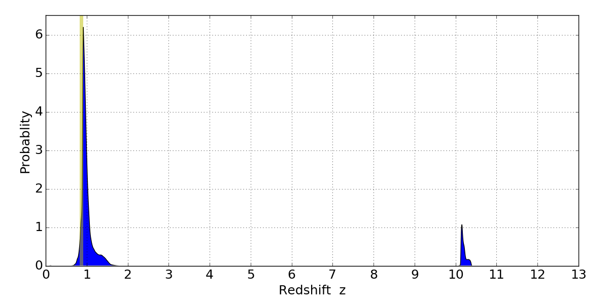 In P(z) plots: Yellow lines mark the cluster redshift z = 0.870,