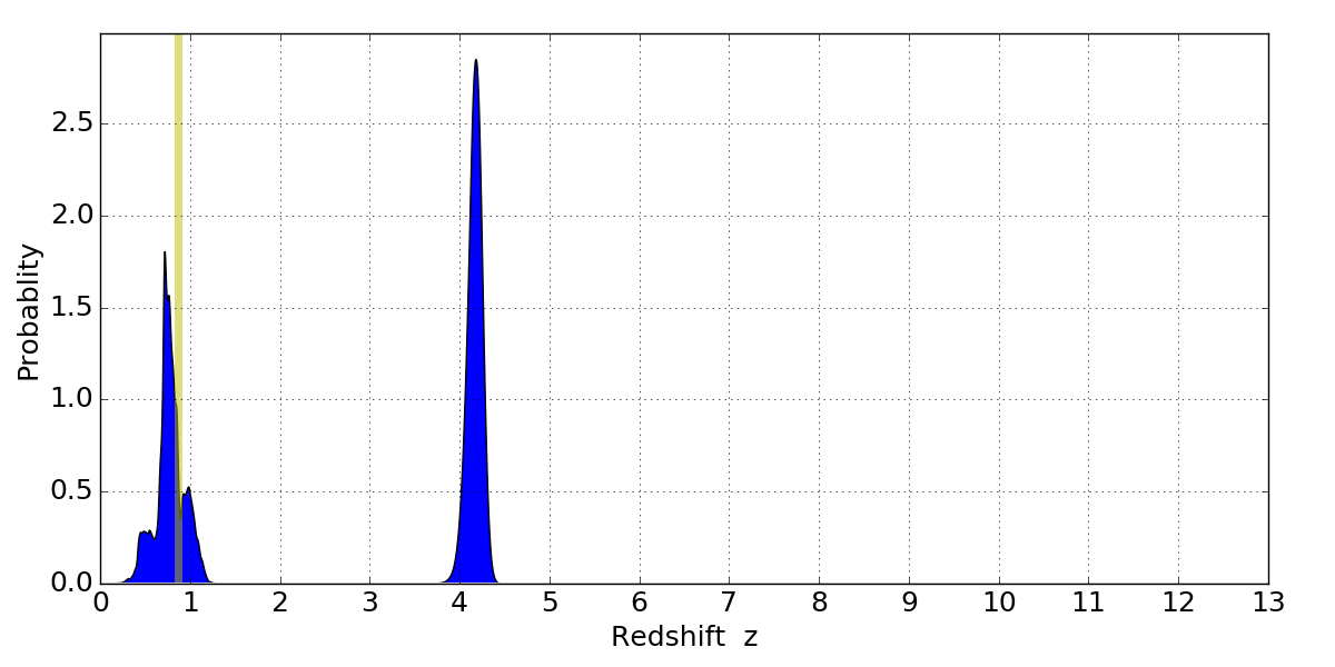 In P(z) plots: Yellow lines mark the cluster redshift z = 0.870,