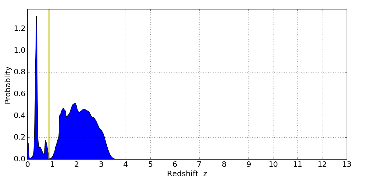 In P(z) plots: Yellow lines mark the cluster redshift z = 0.870,