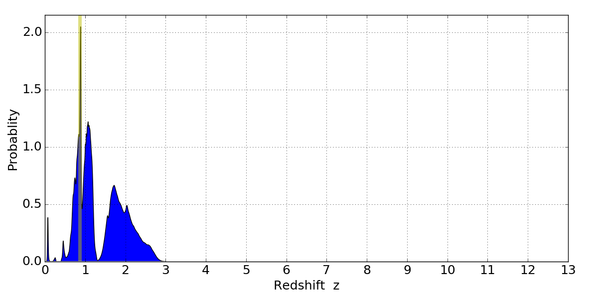 In P(z) plots: Yellow lines mark the cluster redshift z = 0.870,