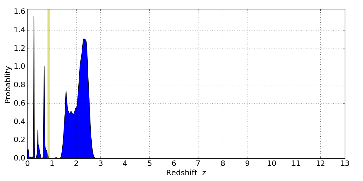 In P(z) plots: Yellow lines mark the cluster redshift z = 0.870,
