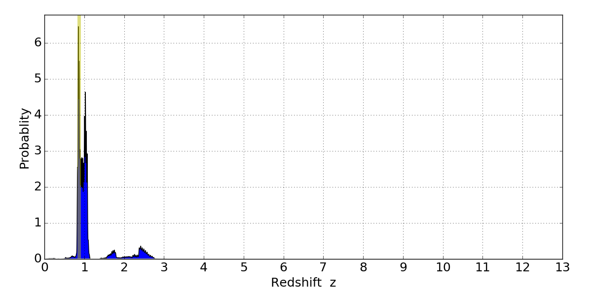 In P(z) plots: Yellow lines mark the cluster redshift z = 0.870,