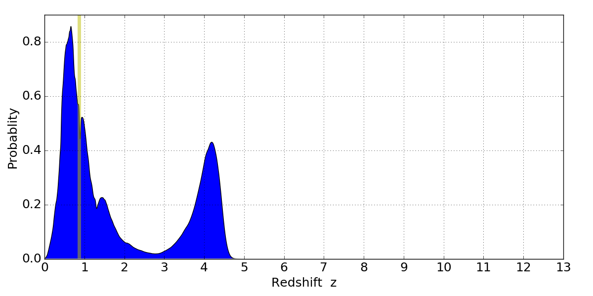 In P(z) plots: Yellow lines mark the cluster redshift z = 0.870,