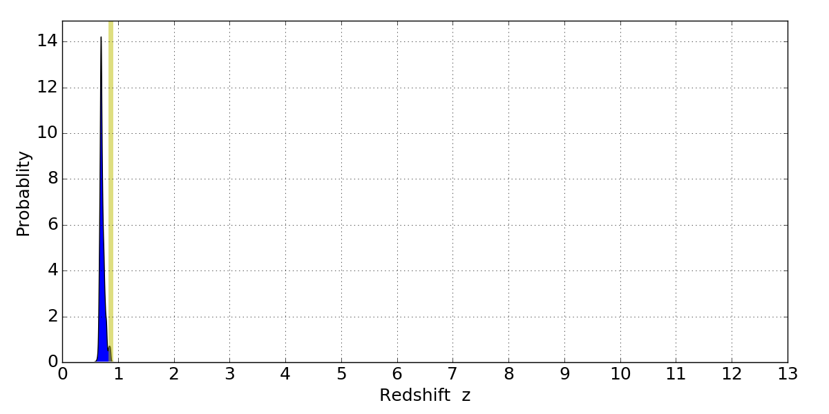 In P(z) plots: Yellow lines mark the cluster redshift z = 0.870,