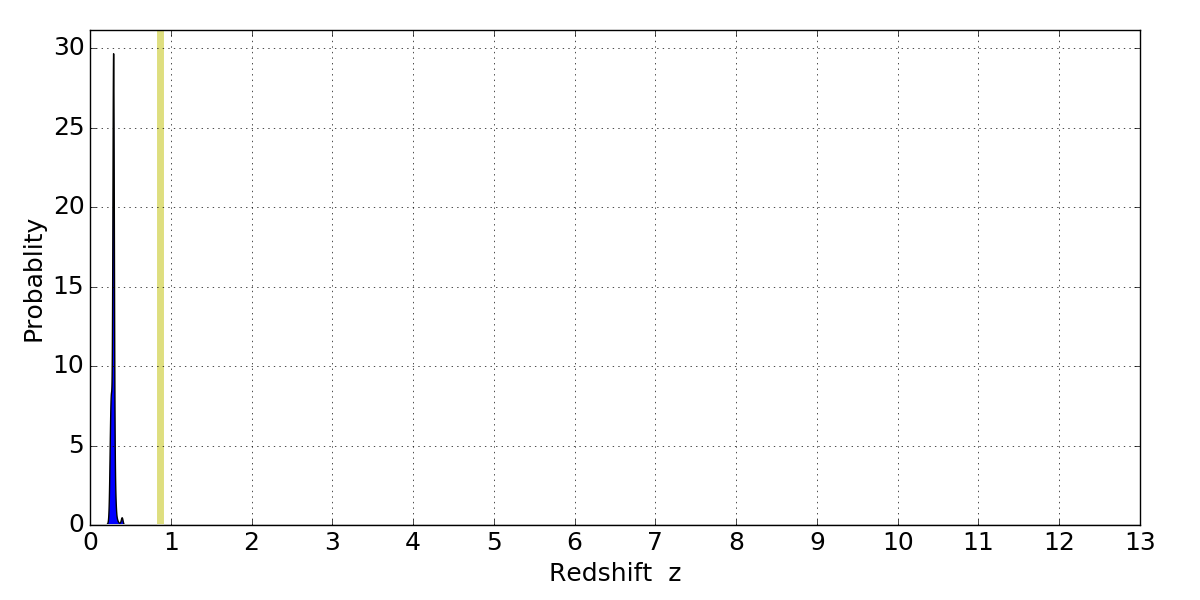 In P(z) plots: Yellow lines mark the cluster redshift z = 0.870,