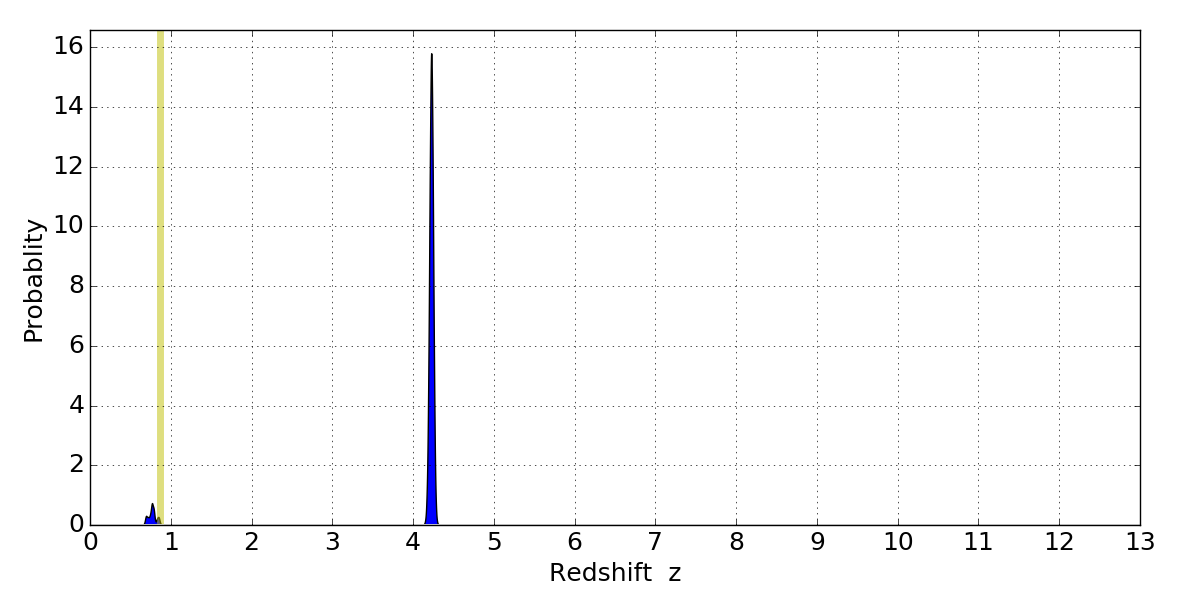 In P(z) plots: Yellow lines mark the cluster redshift z = 0.870,
