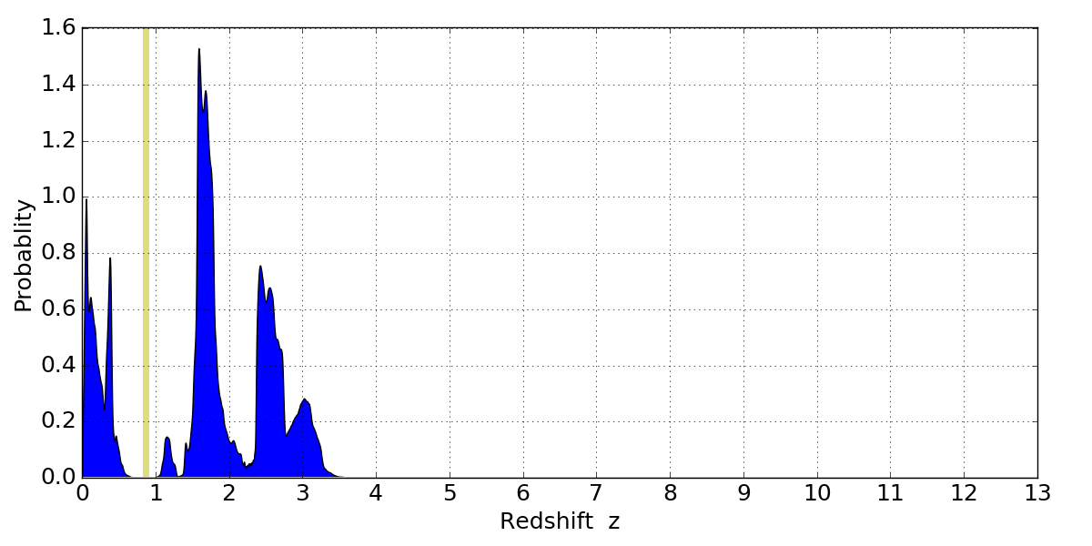 In P(z) plots: Yellow lines mark the cluster redshift z = 0.870,