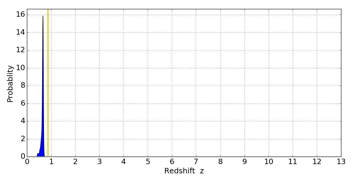 In P(z) plots: Yellow lines mark the cluster redshift z = 0.870,