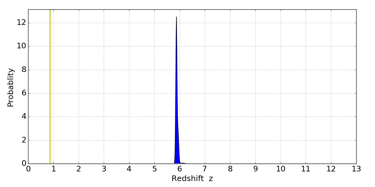 In P(z) plots: Yellow lines mark the cluster redshift z = 0.870,