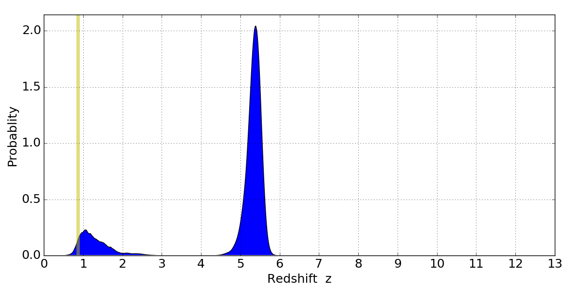 In P(z) plots: Yellow lines mark the cluster redshift z = 0.870,