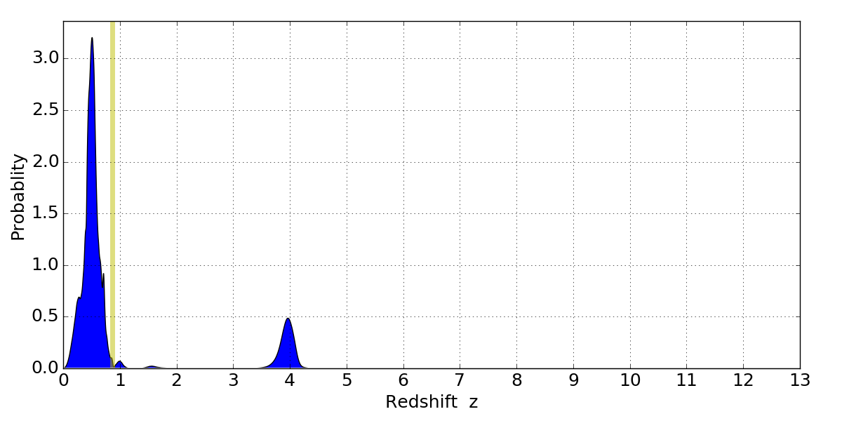 In P(z) plots: Yellow lines mark the cluster redshift z = 0.870,