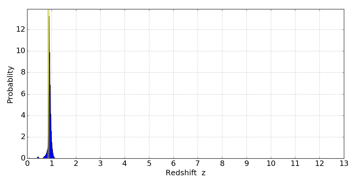 In P(z) plots: Yellow lines mark the cluster redshift z = 0.870,