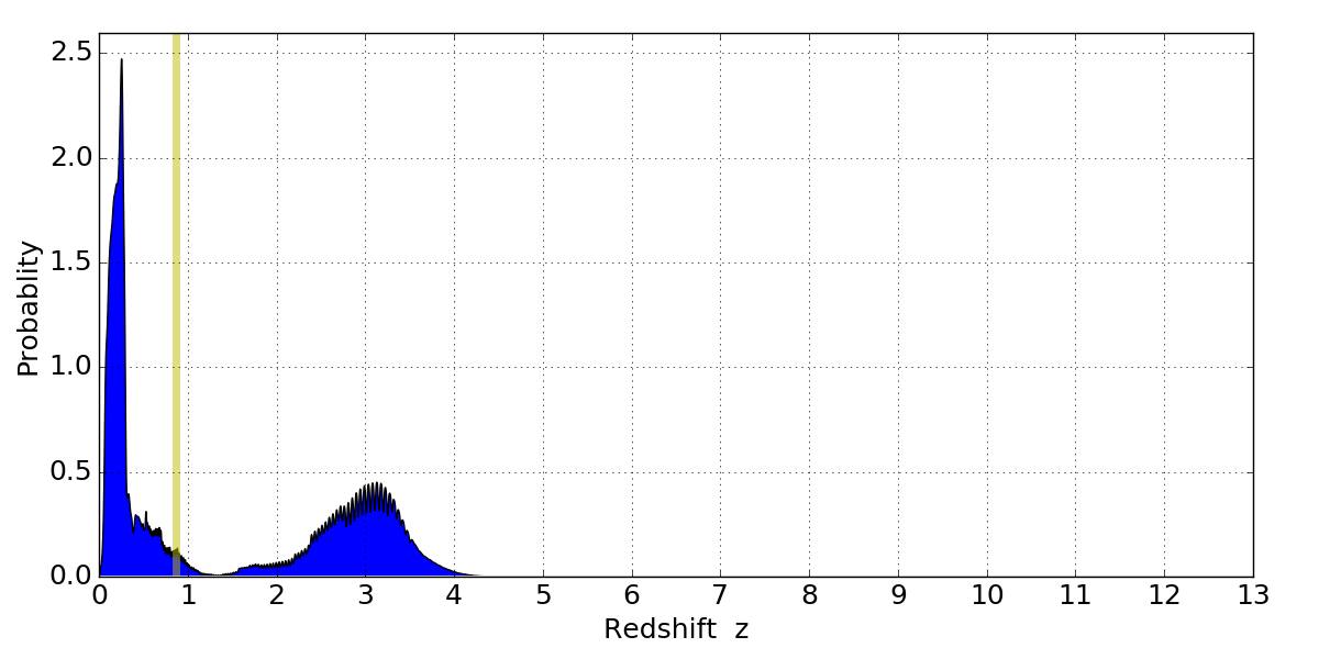 In P(z) plots: Yellow lines mark the cluster redshift z = 0.870,