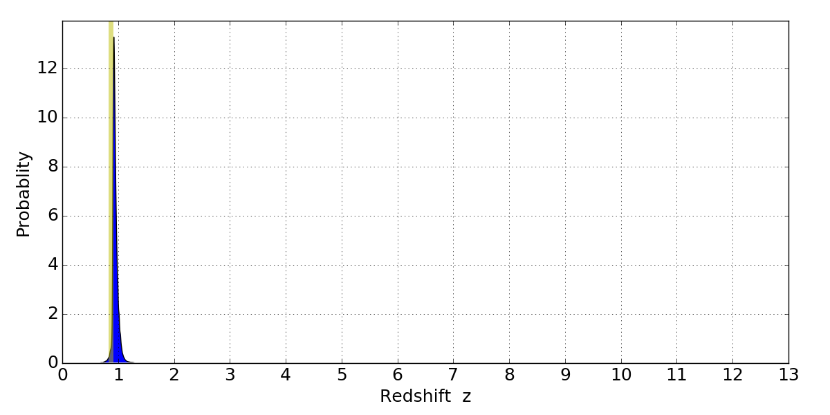 In P(z) plots: Yellow lines mark the cluster redshift z = 0.870,