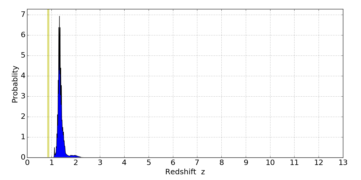 In P(z) plots: Yellow lines mark the cluster redshift z = 0.870,