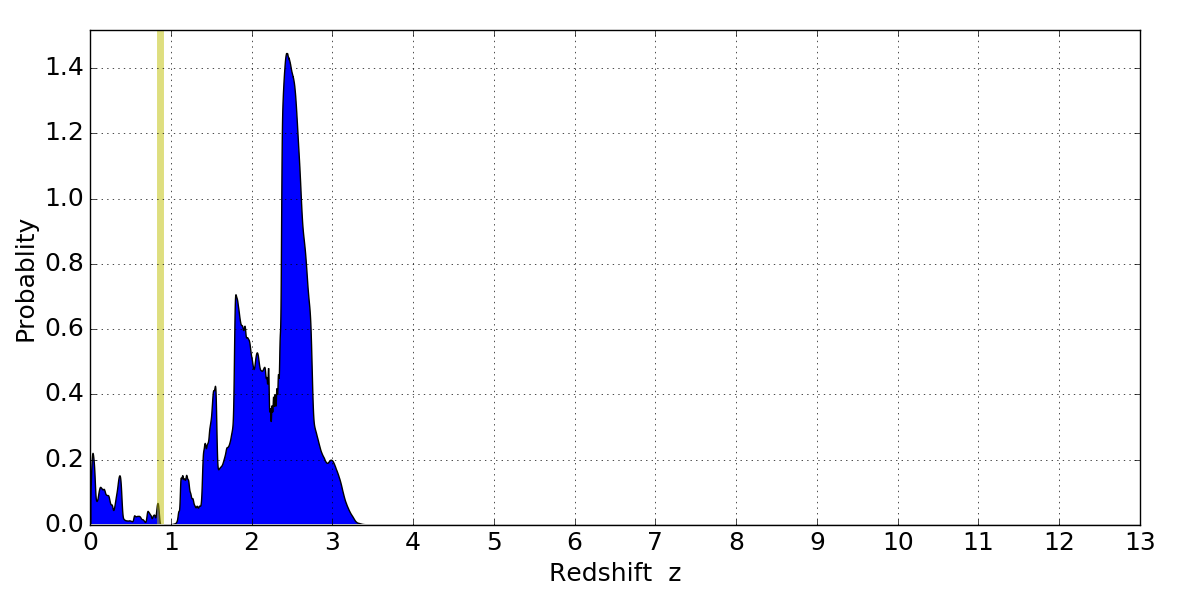 In P(z) plots: Yellow lines mark the cluster redshift z = 0.870,