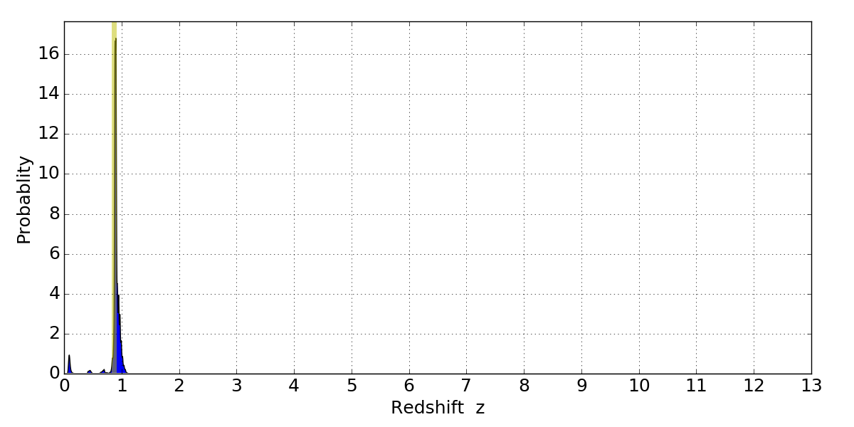 In P(z) plots: Yellow lines mark the cluster redshift z = 0.870,