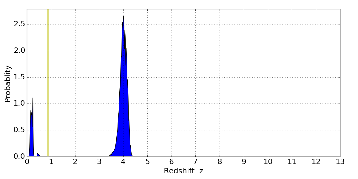 In P(z) plots: Yellow lines mark the cluster redshift z = 0.870,