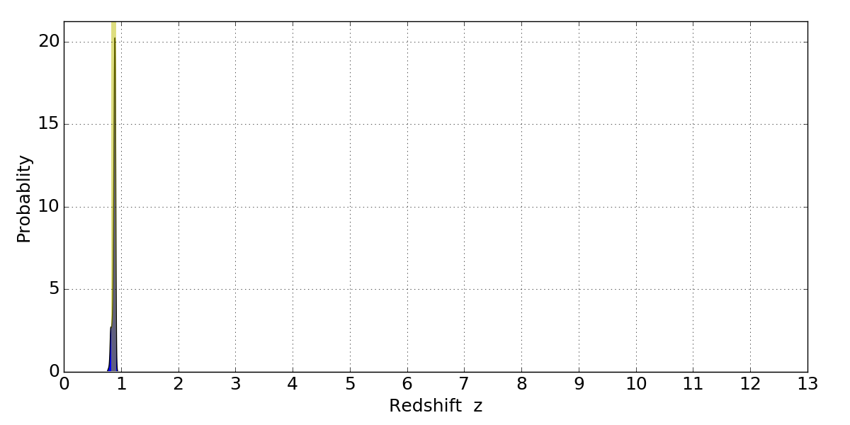 In P(z) plots: Yellow lines mark the cluster redshift z = 0.870,