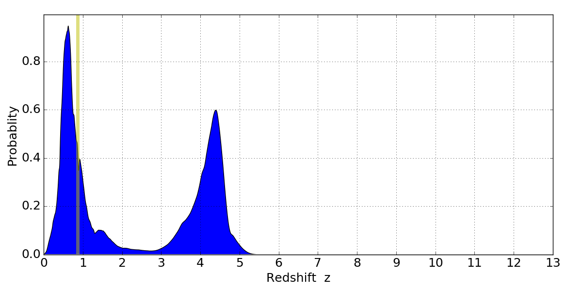 In P(z) plots: Yellow lines mark the cluster redshift z = 0.870,