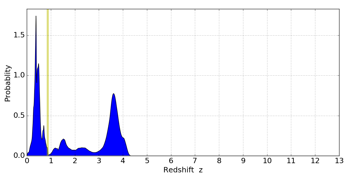 In P(z) plots: Yellow lines mark the cluster redshift z = 0.870,