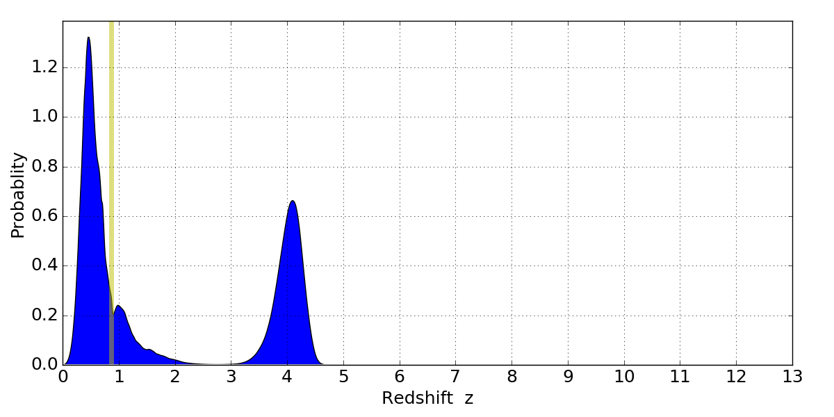 In P(z) plots: Yellow lines mark the cluster redshift z = 0.870,