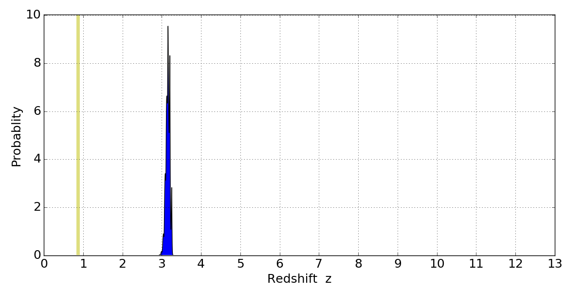 In P(z) plots: Yellow lines mark the cluster redshift z = 0.870,