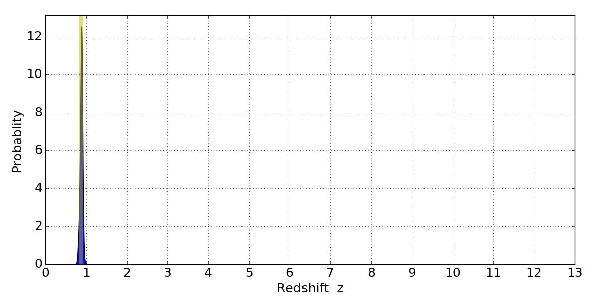 In P(z) plots: Yellow lines mark the cluster redshift z = 0.870,