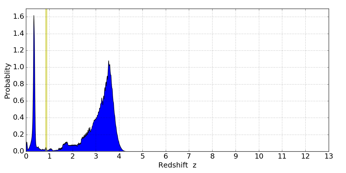 In P(z) plots: Yellow lines mark the cluster redshift z = 0.870,