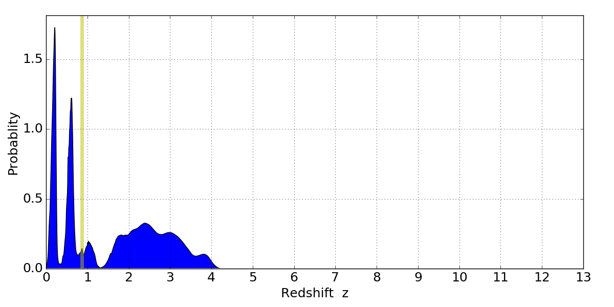 In P(z) plots: Yellow lines mark the cluster redshift z = 0.870,