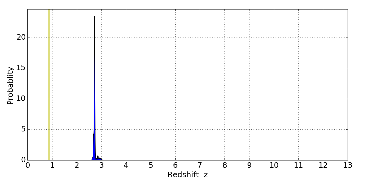 In P(z) plots: Yellow lines mark the cluster redshift z = 0.870,