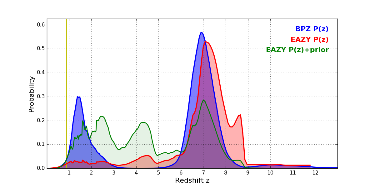 In P(z) plots: Yellow lines mark the cluster redshift z = 0.870,