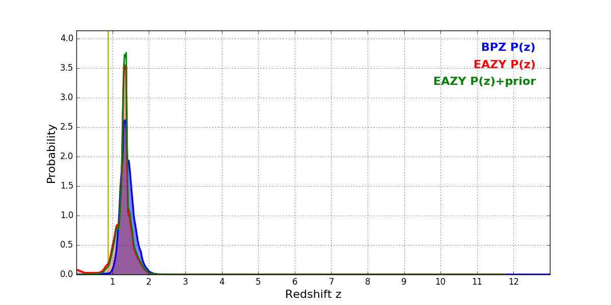 In P(z) plots: Yellow lines mark the cluster redshift z = 0.870,