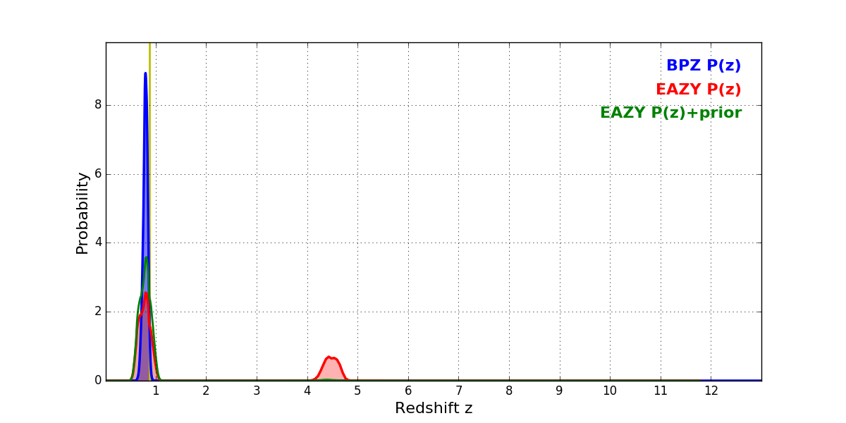 In P(z) plots: Yellow lines mark the cluster redshift z = 0.870,